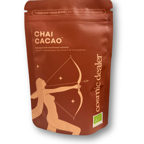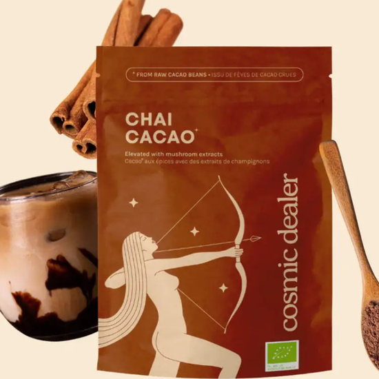 Découvrez notre chocolat à boire chai cacao, un mélange réconfortant et moderne associant cacao d’origine unique d’Équateur, épices chai, superfruit lucuma et extraits de champignons adaptogènes biologiques.