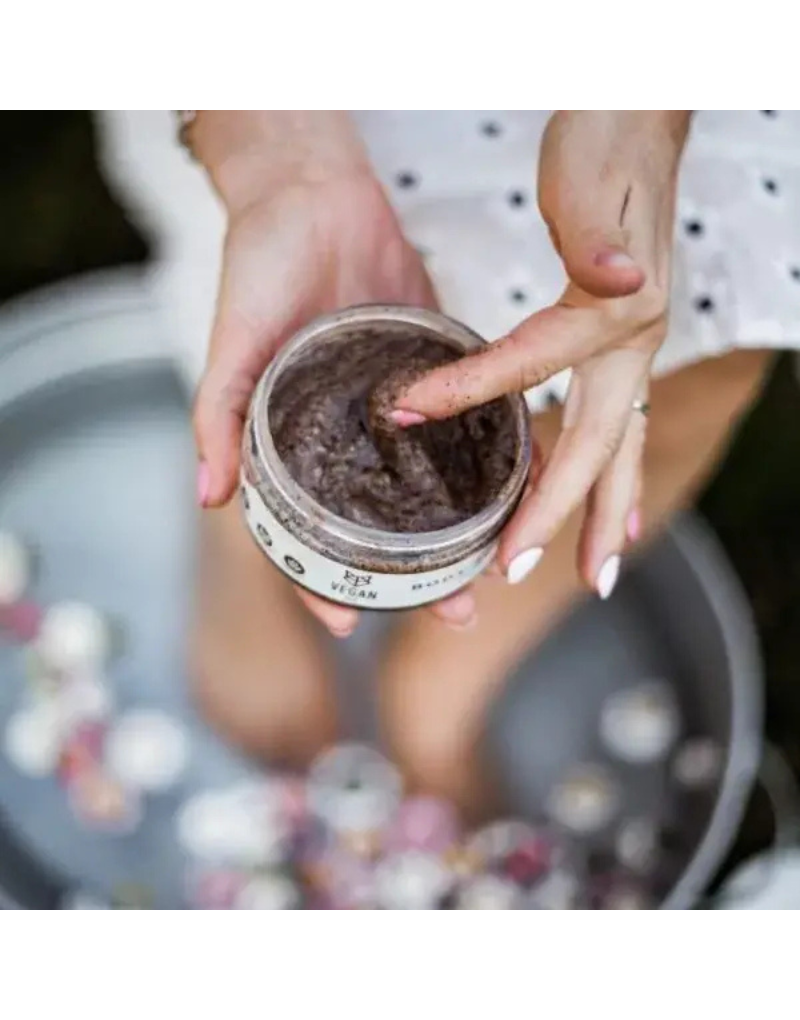 - Ingrédients : sel, huile de pépins de raisin, beurre de karité, huile de jojoba, grains de café, poudre de noyaux d’abricot, huiles naturelles, vitamines C & E