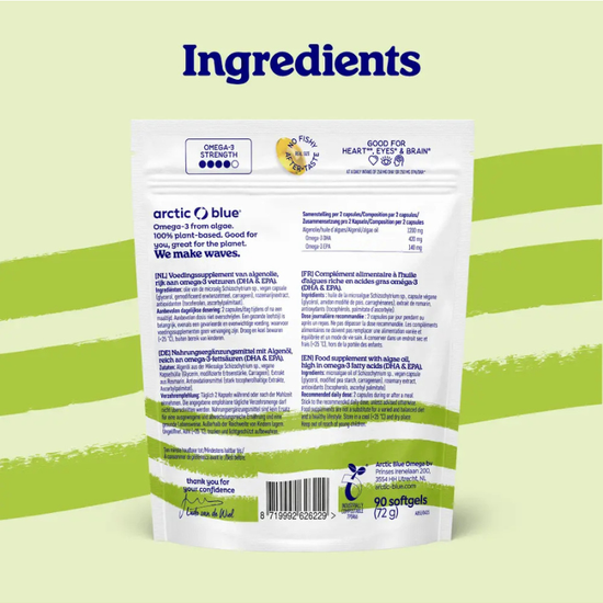 Découvrez notre huile d’algues 100% végétale, source naturelle de DHA et EPA, les acides gras oméga-3 essentiels à la santé cardiovasculaire, cérébrale et visuelle. Obtenus à partir d’algues cultivées dans un environnement contrôlé, ces oméga-3 offrent les mêmes bénéfices que l’huile de poisson sans impact sur les océans et sans contaminants.